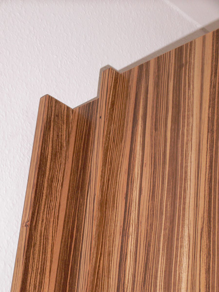 Es hätte sich auch die Infront- oder Mixfrontvariante, bzw. die Boden-/Deckenmontage angeboten. Die Materialauswahl der Fronten ist komplex, da ein riesiges Angebot zur Verfügung steht. Gewält wurde eine flächige, statt einer gegliederten Front (z.B. Rahmen und Füllung), aus Echtholzfurnier als Zebrano, klar ablackiert (s. Foto 2).