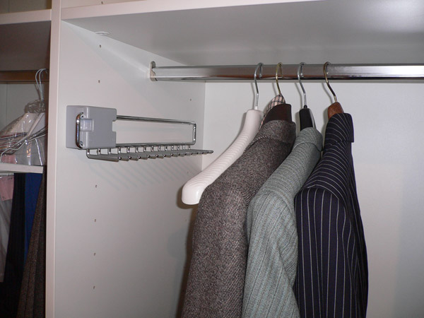 Die Inneneinrichtung des Schrankes erfolgt nun nach Ihren Wünschen. Es gilt eine Auswahl zu treffen unter den angebotenen Beschlägen wie Hosenauszügen, Krawattenauszügen, Haken und Kleiderstangen, Körben, ausziehbaren Böden, Einlegeböden oder gegebenenfalls Liften. Außerdem wird die Anzahl und Position von Schubkästen bestimmt (s. Fotos 5 - 8).