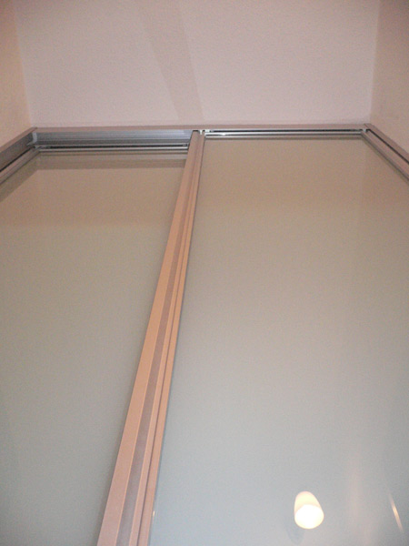 Garderobe eingepasst in Nische. Schiebetüren aus Aluminiumprofilen und VSG-Glas-Füllungen. Eine sehr ansprechende Frontenlösung für Nischen.