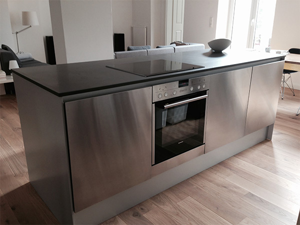 Küche mit Betonarbeitsplatte, Griffmulden und Edelstahlfronten