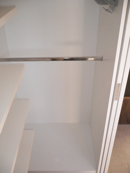 Begehbarer Kleiderschrank in Dachschräge. Schiebetür mit klassischer Rahmen- und Füllungsgestaltung, weiß lackiert. Schubkästen mit griffloser Tip-on Technik.